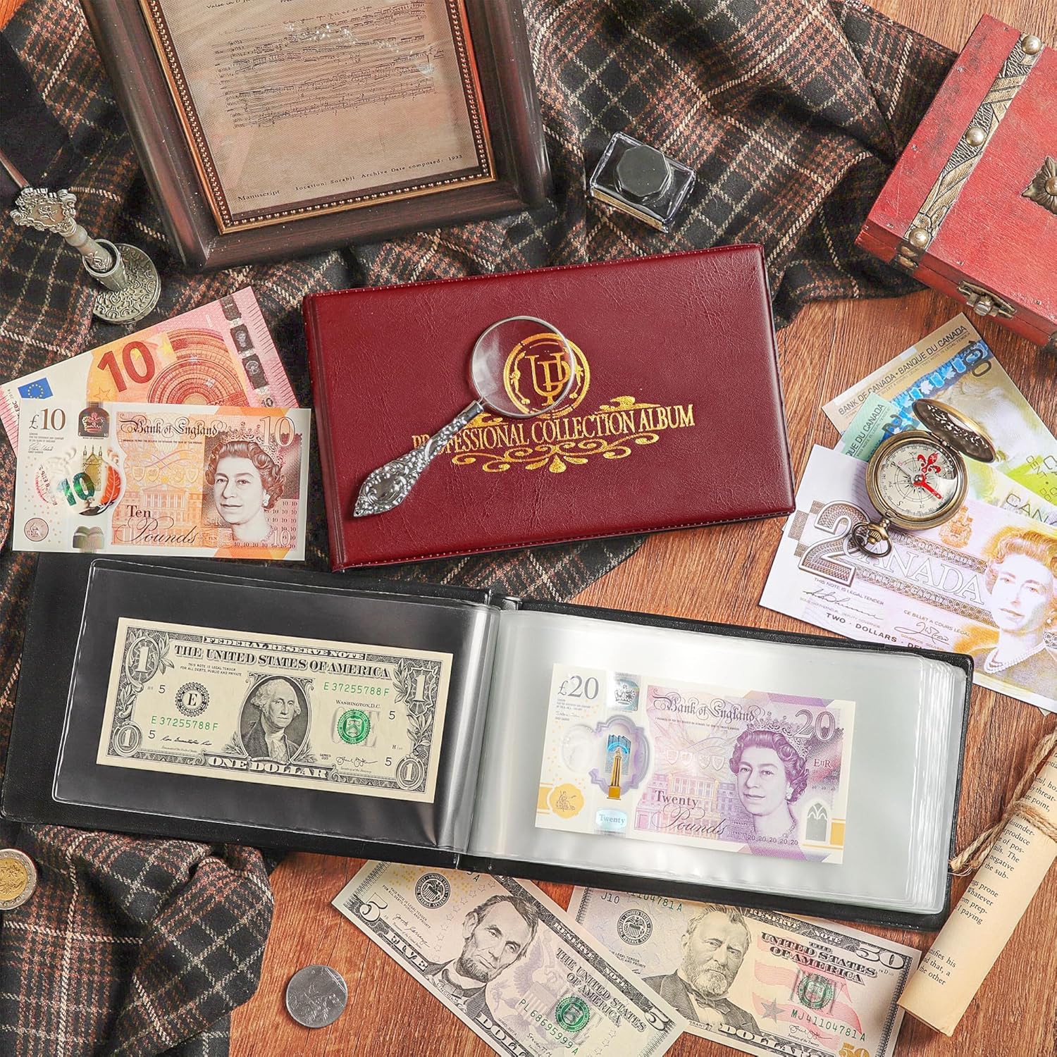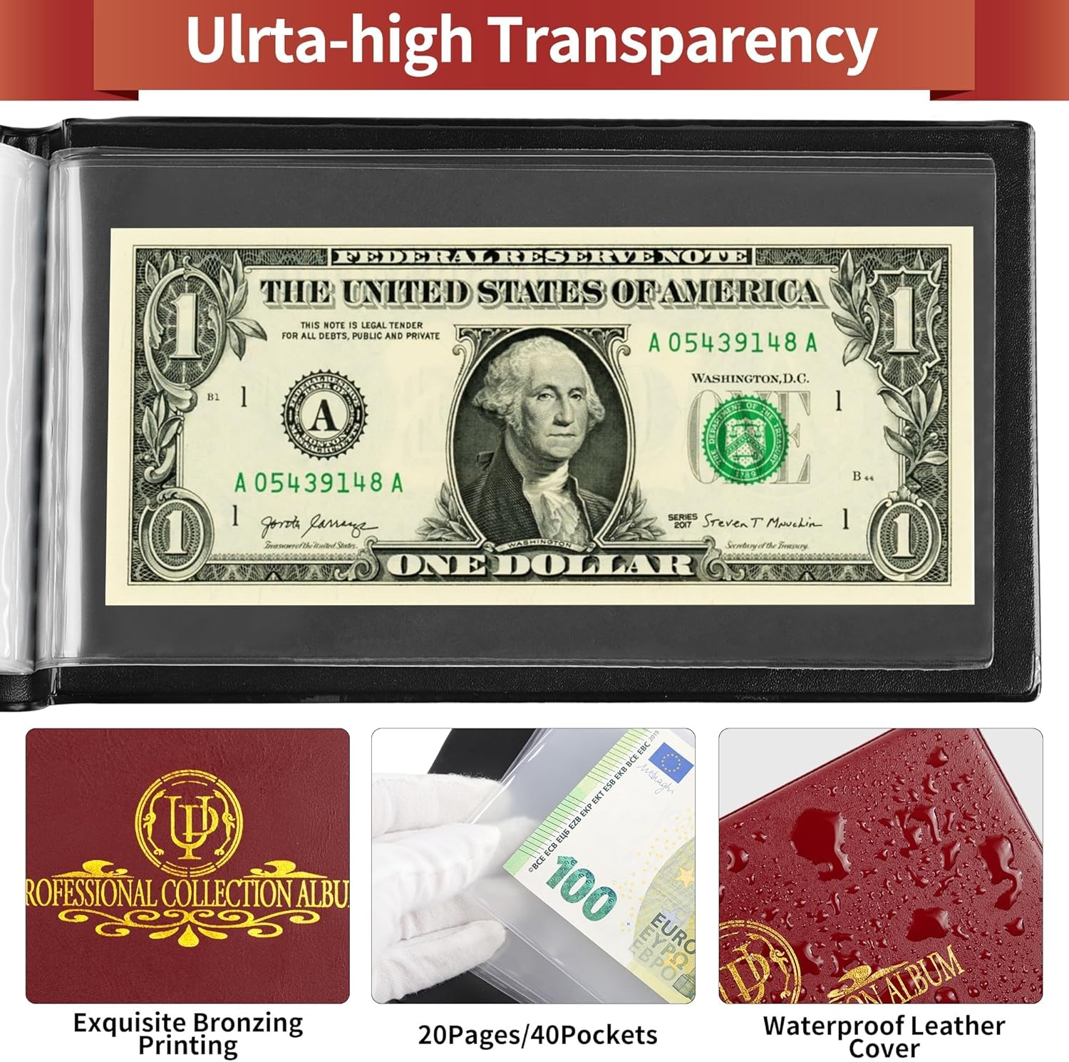 - 【BONUS DESIGN】- Banknote collecting album can be completely flattened at 180°, and the highly transparent inner pages are easy to assemble and display banknotes.