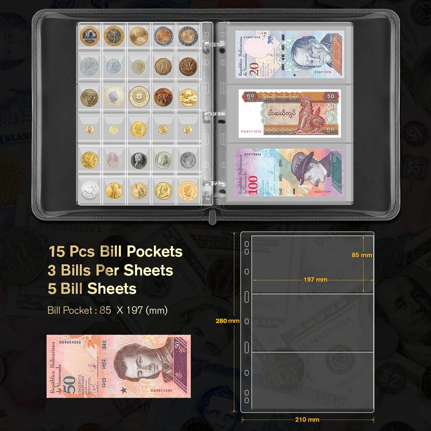 - Fits Coins & More: Includes 10 pages with 35×35 mm pockets and 5 pages with 45×45 mm pockets to accommodate various coin sizes. Plus 5 bill pages (85×197 mm) that also work for tickets and other collectibles.