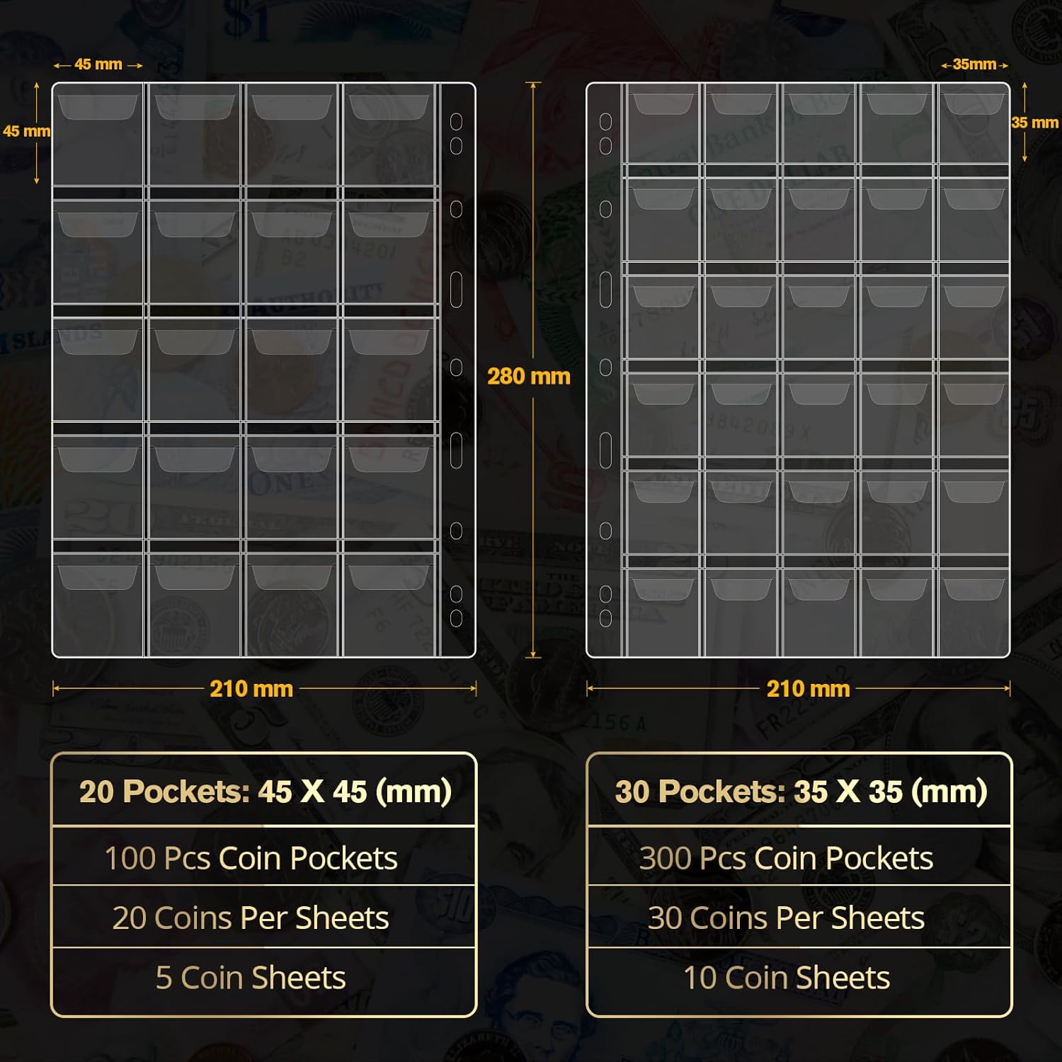 10 pages feature 35 × 35 mm pockets —ideal for pennies, nickels, dimes, quarters, and other small to medium coins. 5 additional pages offer larger 45 × 45 mm pockets for half-dollars, silver dollars, and commemorative pieces. Rounding out the set are 5 currency pages sized 85 × 197 mm , perfect for banknotes, tickets, stamps or any other.