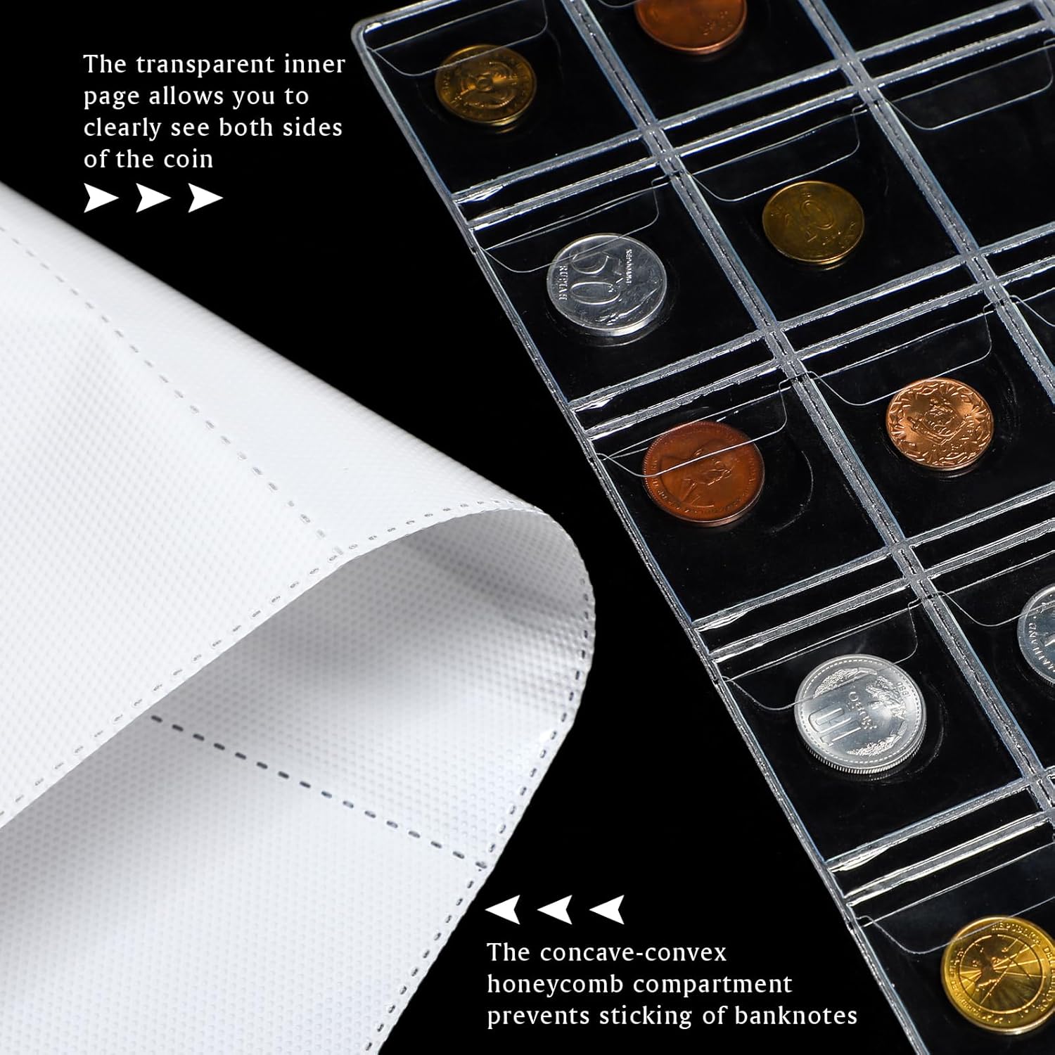 - Store and protect: currency storage album is waterproof and moisture-proof, the coin storage pocket has a baffle to prevent coin from falling and the concave-convex honeycomb-layer can prevent banknotes from sticking; Nice for store and protect precious coins and paper currency